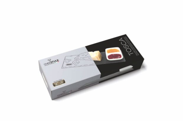 Il tagliere in ardesia “TOSCA” dona un tocco di eleganza. Dotato di gommini antiscivolo e antigraffio, per impedire che il tagliere possa danneggiare tavolate o ripiani, è abbinato con una piccola ciotola doppia di ceramica, pensata per accompagnare il formaggio con miele, aceto balsamico o marmellate. Il marchio Parmigiano Reggiano è inciso al laser. Questo tagliere è inoltre venduto con una sua scatola di alta qualità, per garantire il massimo impatto visivo verso la vostra clientela, anche all’interno di un pacco regalo.